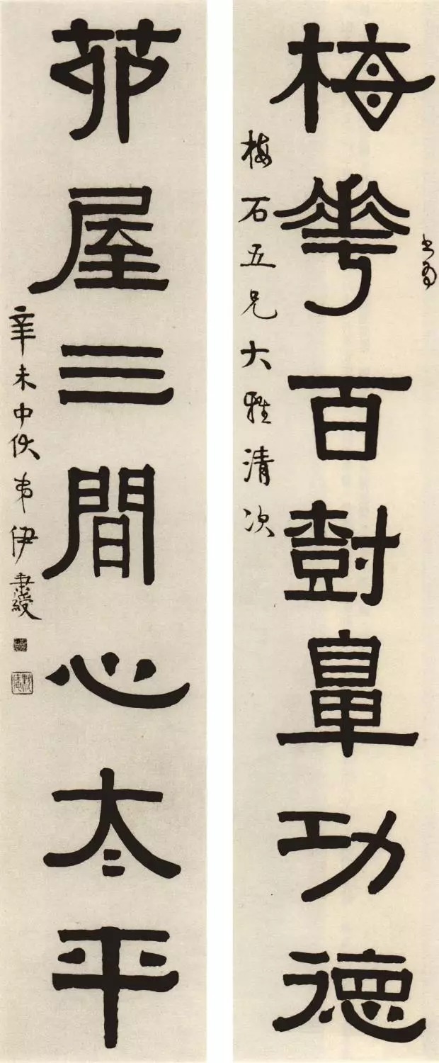 伊秉绶(1754—1815)伊秉绶,字祖似,号墨卿,别署南泉、秋水、西湖长,晚号默庵,又称伊汀洲,福建汀洲宁化人。清学者、书法家。其父伊朝栋,乾隆三十四年进士,历官刑部主事、御史、光禄寺卿。幼秉庭训,师从阴承方,讲求立心行己之学。后受大学士朱珪的赏识与纪晓岚的器重,拜纪为师,又拜刘墉为师学书法。乾隆五十四年(1789)进士,历任刑部主事,后擢员外郎。嘉庆四年(1799)任惠州知府,因与其直属长官、两广总督吉庆发生争执,被谪戍军台,昭雪后迁为扬州知府。历署河库道、盐运使。以父丧离职,遂不再出。工诗古文,究心理学,精书法,行、楷、隶皆工,尤以隶书独具特色、雄冠清代。有《留春草堂诗》、《坊表录》、《修齐正论》、《攻其集》等。嘉庆三年六月九日长生古瓦斋,素人先生尊兄属,弟伊秉绶书。句赠云岡三兄老先生并正之,嘉庆八年二月朔,汀州弟伊秉绶。句赠正邻行书翰林并求是正,嘉庆乙丑春日,寓弟伊秉绶。敬题招武将军祠堂,即呈贤裔竹庐都尉正之,嘉庆二十年乙亥岁八月朔,扬州旧守汀州伊秉绶顿首。香光楹帖墨迹在曾宾谷处,临为心原三兄,乙亥新秋,秉绶。