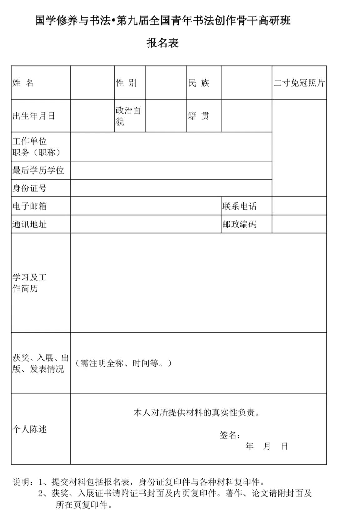 《国学修养与书法•第九届全国青年书法创作骨干高研班报名表》