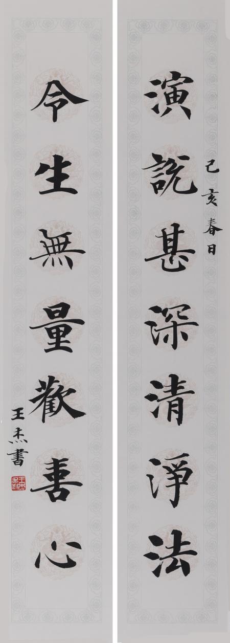 除了榜书,王杰还有为数众多的“中楷”。这些类似于“版刻”般严整匀称的楷书,则显得更为轻松随意,端正、妍美,却又活泛多姿。对此,我曾戏称王杰为“书法字典造字机”。玩笑归玩笑,但从严格的意义上来说,这类楷书往往适于厅堂与书斋张挂,实用性与美观性二者兼具,笔阵严整,连绵起势,绝非“算子之布”。从字形个体而言,行止干脆,笔势活洽,关节劲健,偃仰俯合,富余变化;从整体而言,参差纵横,起落缤纷,韵致飞扬。我以为此类“中楷”,王杰更多经营的是阵势、章法与气度,一纸之间,或如壮士持戈,或如美女舞袖,笔墨无声铿锵,点画流光溢彩,起伏连绵,呼应衔接,纸面全活,气息洄环,给人以爽心悦目之感。简而言之,寻常中楷能在一纸之上,写到个体体式规范,整体起伏跌荡,一纸烂漫,那才是真正的书法艺术。