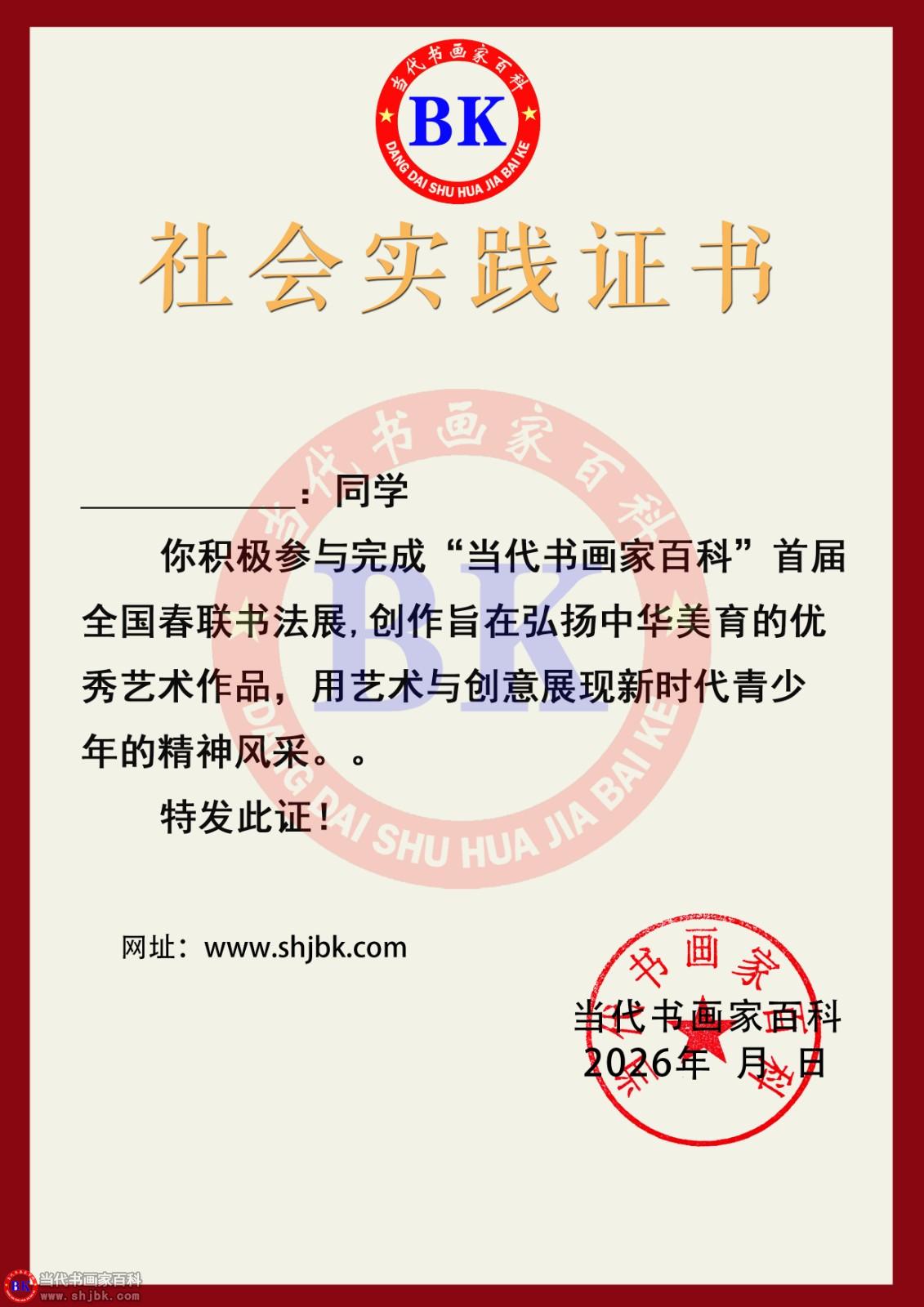 一、举办单位 主办单位:当代书画家百科 二、征稿要求 (一)展览组别 1.成人组:年满18周岁的社会各界人士。 2.中小学生组:未满18周岁的中小学生; (二)作品要求 1.内容:赞颂新时代中国日新月异的变化,描绘国泰民安的盛世景象,以及最受老百姓欢迎的常用春联(含横批),内容喜庆,应遵循社会主义核心价值观,思想性、艺术性并重,提倡自己创作,注意格律要求。 2.规格不限,红色纸张。 三、参赛方式 1.关注当代书画家百科微信公众号。 2.QQ:2089880689发送。 3.按要求填写相关信息,发送到QQ,即报名成功。注:图片需上传两张,一张是春联参赛作品图片,另一张是参赛交费截图。(参赛作品如下拍摄上传) 4.照片要求:清晰方正,且作品内容完整(为保证图片质量,强烈建议手机拍摄后用扫描软件处理后上传)。 四、参赛费用 1.作品参评费:每件作品需交参评费15元,未交参评费的作品不予评选。 2.交费方式:微信识别二维码交费(注:交费时备注参赛者姓名,集体参赛可加联系人,进行转账) 五、征稿日期 即日起至2026年1月20日 六、参赛待遇 1、成人组入展作者颁发电子版荣誉证书。 2、学生组入展作者颁发电子版荣誉证书、社会实践证书。 3、入展作品在当代书画家百科官网、百度、各大浏览器、专业书画网站、微信公众平台全网覆盖。 高清电子证书可自行打印 证书样式 七、其它事项 凡报名参赛者均被视为默认同意本启事所有安排。本征稿启事最终解释权归当代书画家百科。